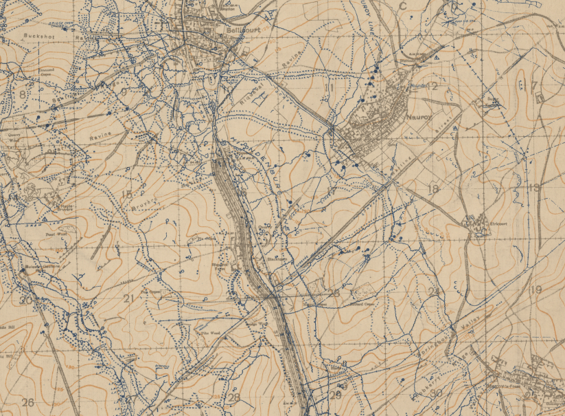Problems caused in the initial attack on the Hindenburg Outpost Line on the 18th September to the left of the Australian Corps meant that the ‘land bridge’ over the tunnel could not be taken on the 29th September attack and Lieut.-Gen. Monash had to abandon taking the Hindenburg Line System in one blow. On the 1st October the exhausted 3rd & 5th Australian Divisions were relieved by the 2nd Australian and British 50th Divisions. During the evening the 22nd Battalion began its move forward to Billiard Copse (see map reproduced with permission of the National Library of Scotland plus click link for geo-referenced map, location G.23.b.&d.) near Nauroy. This final stage was made at short notice in intense darkness and without guides, with a compass bearing the sole aid to navigation. All the obstacles of the Hindenburg Line had to be crossed and the track lay across a deep canal and over difficult and entirely strange countryside. En-route the moving companies were bombed by a low flying German aeroplane, but no casualties resulted. The destination was reached soon after midnight and great credit was due to Lieut. Smith, MC, MM for his map and compass reading skills. Billiard Copse lay well within the Hindenburg Line and the village of Nauroy had been strongly fortified by the enemy. The trench systems here covered some thousands of yards in breadth and extended from the canal on the west to the Beaurevoir Line to the east. Here the 6th Brigade and the 22nd Battalion waited for orders to attack the Beaurevoir defences and bivouacked for the night.