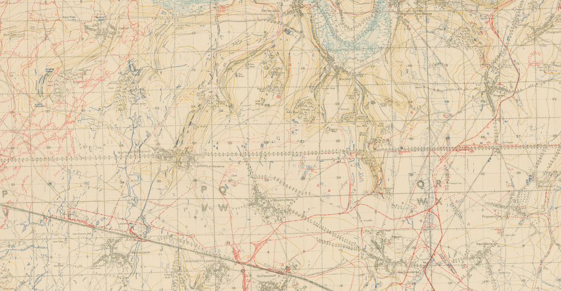 By the 29th August 1918 the great bend in the river where line of the Somme now flowed south to north had been reached and all three divisions in the Australian Corps south of the Somme stood upon the high ground sloping down to the river looking past Peronne and as far south as St. Christ (map top right courtesy of Australians on the Western Front, and click on link for geo-referenced Trench Map reproduced with permission of the National Library of Scotland). To the north of the river the 3rd Australian Division kept in step reaching Suzanne, Vaux, Curlu, Hem and Clery. The last two days of the advance led the Australian Corps across the maze of trenches and debris of the 1916 campaign. The weather was unfavourable, there