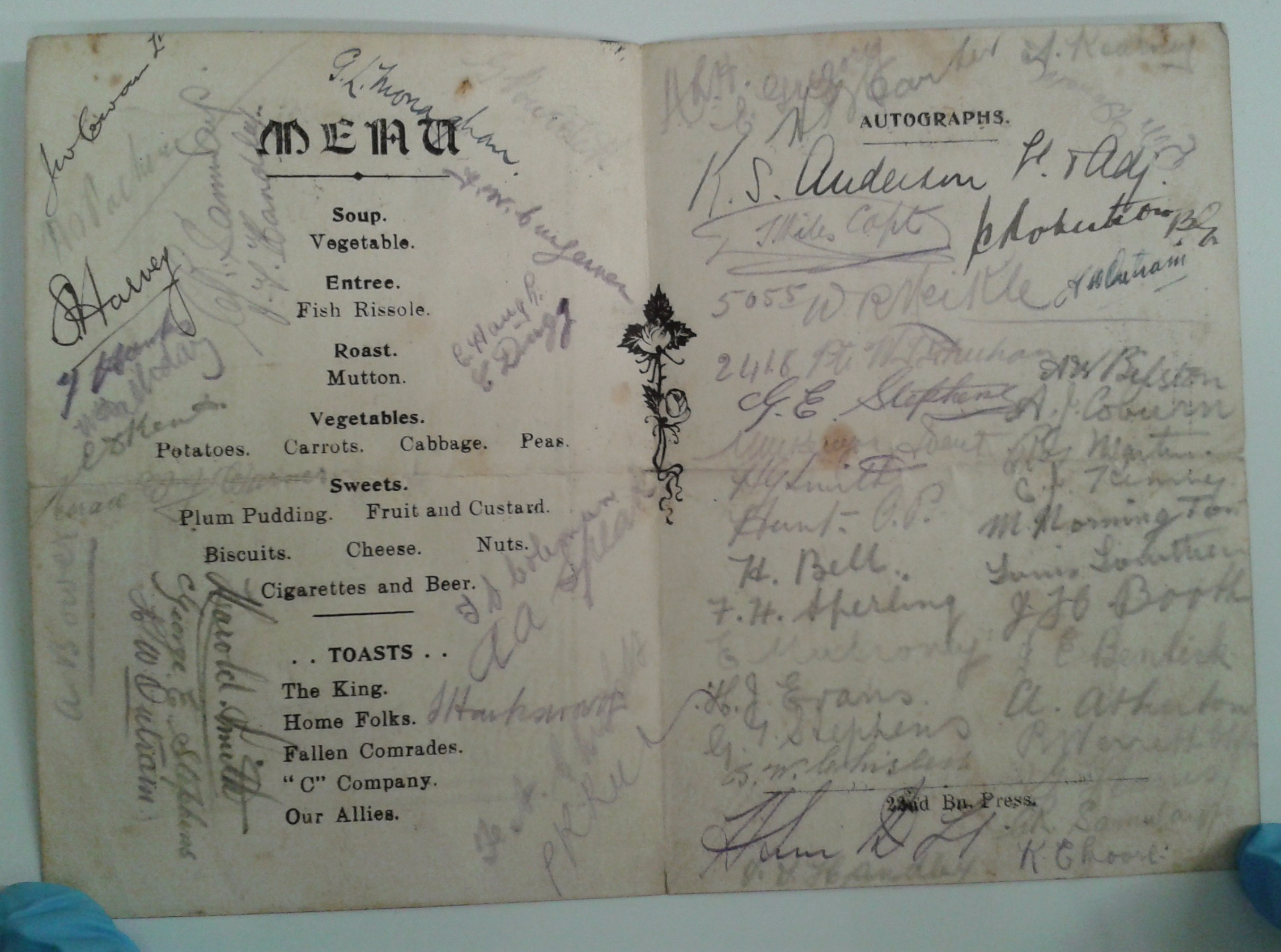 Previous Image Next Image 2015-03-22 12.56.34 22nd Bn ‘C’ Coy Christmas 1918 menu card with signatures