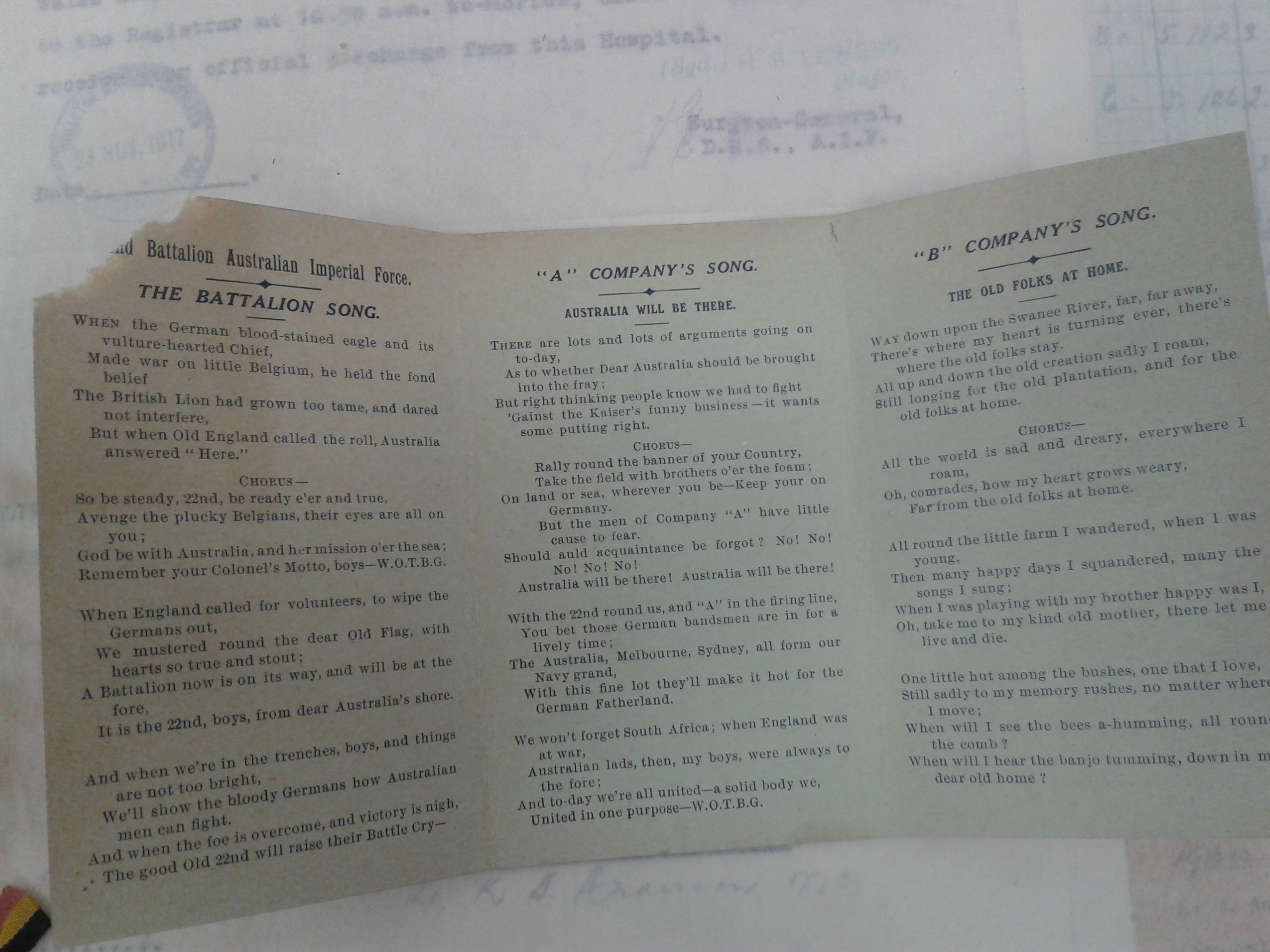 Photographs: 22nd Battalion and the four Company songs, highlighting the use of WOTBG