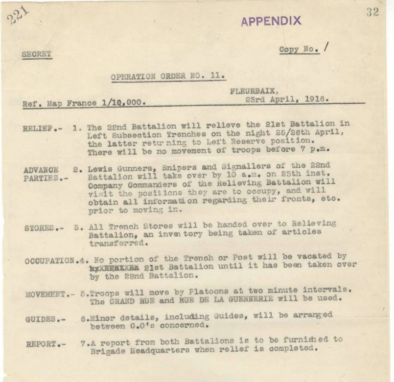 25th April 1916: On the first anniversary of the Anzac Cove landings, the 22nd Battalion moved forward to relieve the 21st Battalion in the front line trenches in accordance with operational orders No.11 (see copy of orders right). The relief was completed at 10.22 pm.