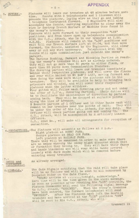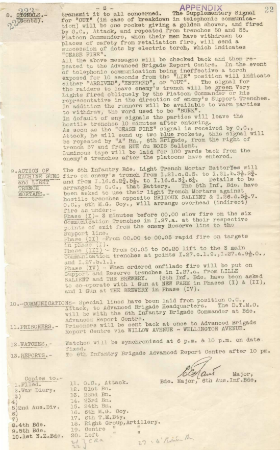 29th June 1916: The night of the 29th/30th June saw the large raid by 8 Officers and 244 other ranks by the 6th Brigade to the south-west of the Armentieres – Wavrin railway. This raid (see Brigade orders, right) was the most important of the Anzac series and involved the expenditure of about 8,000 shells, mainly of field artillery, and 1,000 trench mortars that were targeted on cutting the wire in front of the German lines. This large raiding party, to which each of the four Battalions had contributed an equal quota, had been training for some time near Armentieres under Capt. ARL Wiltshire of the 22nd Battalion. Under the heavy artillery and trench mortar barrage the ‘Black Anzac’ raiders