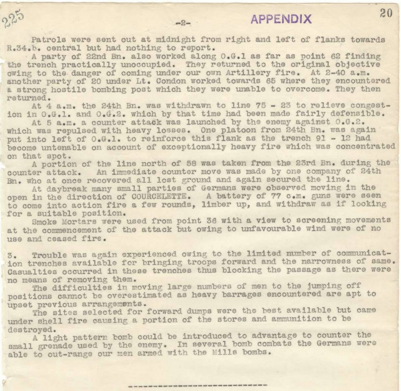 journeys were made by the runners back and forth under the barrage and machine gun fire, including 1892 Pte Claridge (Military Medal) despite being severely wounded made three trips as a messenger, and helped another wounded man back from OG2.