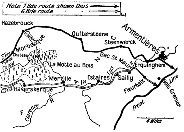 1st May 1916: The 6th Brigade went into reserve and the 22nd Battalion into billets and huts near Erquinghem, then a nice and practically undamaged village though still close to the front line. The battalion remained there for six weeks, training and conducting fatigues including the laying of wiring and digging of reserve lines. Steel helmets and box respirators were not plentiful at this time, but in May the battalion received more.