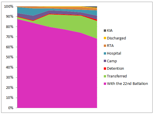 End of month summary for the 154 men that left Melbourne as the 5th/22nd: 123 men with the 22nd Battalion; 19 transferred to another unit; 5 in camp; 3 in hospital; 1 in detention; 2 returning to Australia; 1 discharged