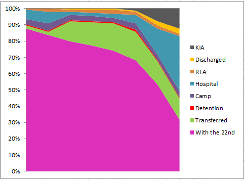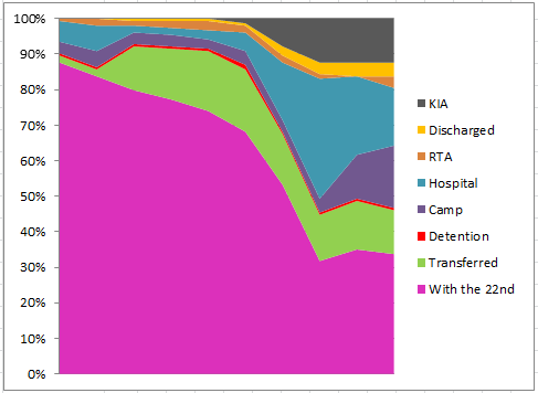 End of month summary for the 154 men that left Melbourne as the 5th/22nd: 37 men with the 22nd Battalion; 17 transferred to another unit; 1 in detention; 36 in camp; 26 in hospital; 8 returning to Australia; 6 discharged; 23 Killed in Action
