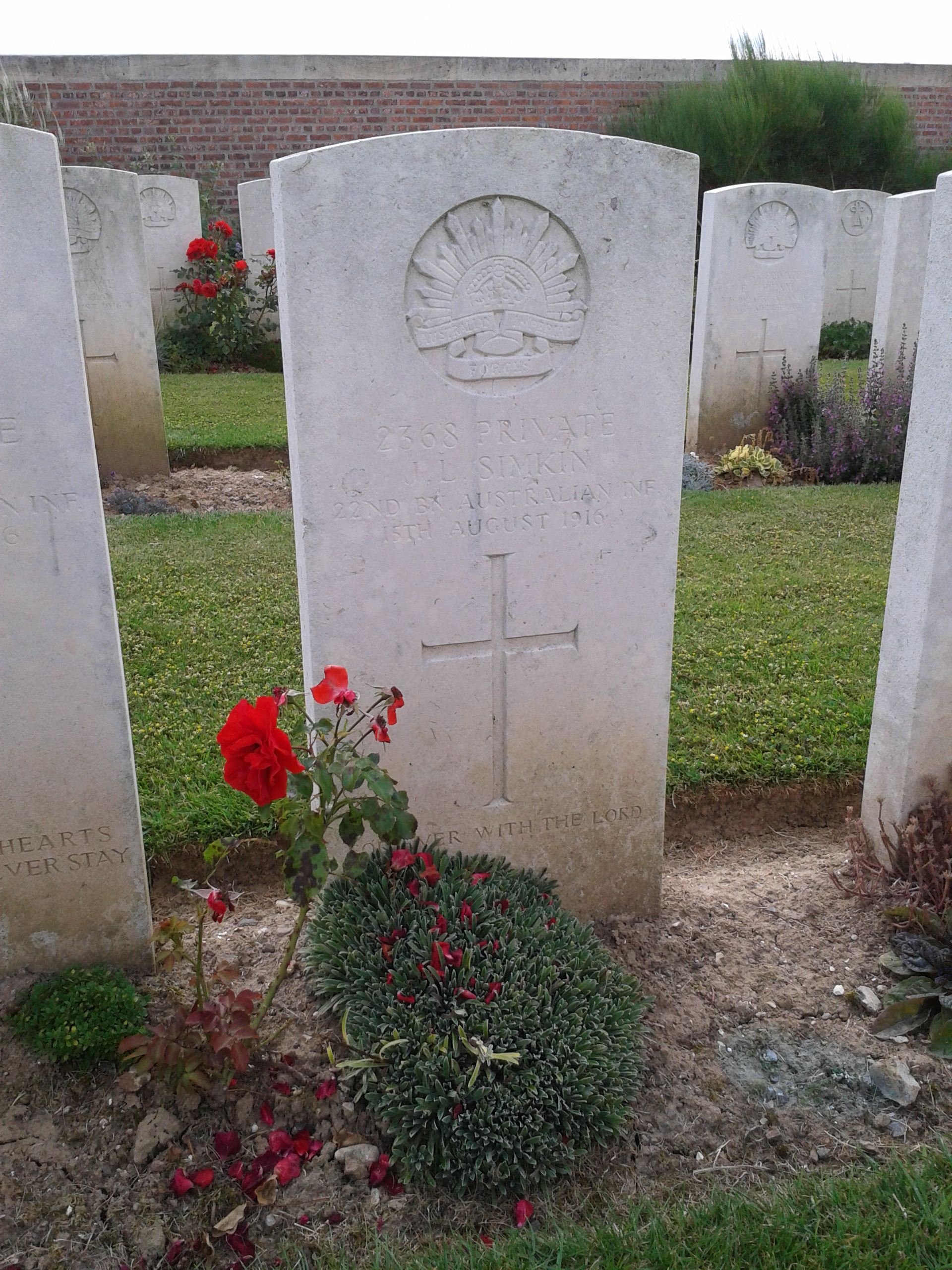 26 year-old driver James Simkin from Kew enlisted into the AIF on the 12th July 1915 and sailed on the RMS Osterley with the 5th/22nd on 29th September 1915 for Egypt. While training in the desert Pte Simkin along with the rest of the 5th/22nd was Taken on Strength into the 22nd Battalion on the 8th January 1916. While in the Canal Zone Pte Simkin was charged with Conduct to the Prejudice of Good Military Order for leaving ranks without permission at Ferry Post for which he was awarded 48 hours Field Punishment Number 2. On 19th March 1916 Pte Simkin sailed on the Llandovery Castle as the AIF joined the BEF in France. Pte Simkin served with the 22nd Battalion in the ‘nursery’ sector of Bois Grenier before moving south as part of I Anzac Corps for the great Somme offensive. The 22nd Battalion moved forward into Pozieres in the early hours of 27th July 1916 with Pte Simkin, as part of C Company, occupying the front line trenches. Here the Battalion endured a terrific bombardment from the German guns until they were relieved on 30th July. During the fighting of 27th July – 4th August Pte Simkin was Mentioned in Dispatches ‘for distinguished and gallant services and devotion to duty during the hard fighting around Pozieres’. The relief was short lived and on 4th August the 22nd Battalion commenced its passage through the heavily shelled trenches of Pozieres to the jumping off trench for an attack on the German trenches known as OG1 and OG2. C Company successfully pushed through to OG2 and began to dig in, in preparation for the counter-attack which came at dawn. It was during the fighting on 4th August 1916 that Pte Simkin was wounded in action with a gunshot wound to the abdomen. He was taken to the 3rd Casualty Clearing Station at Puchevillers but sadly died eleven days later of his wounds and was buried at the nearby Puchevillers British Cemetery. Pte Simkin had a younger brother alongside him in the 5th/22nd, 2369 Pte E Simkin, who despite also being wounded at Pozieres survived the war.