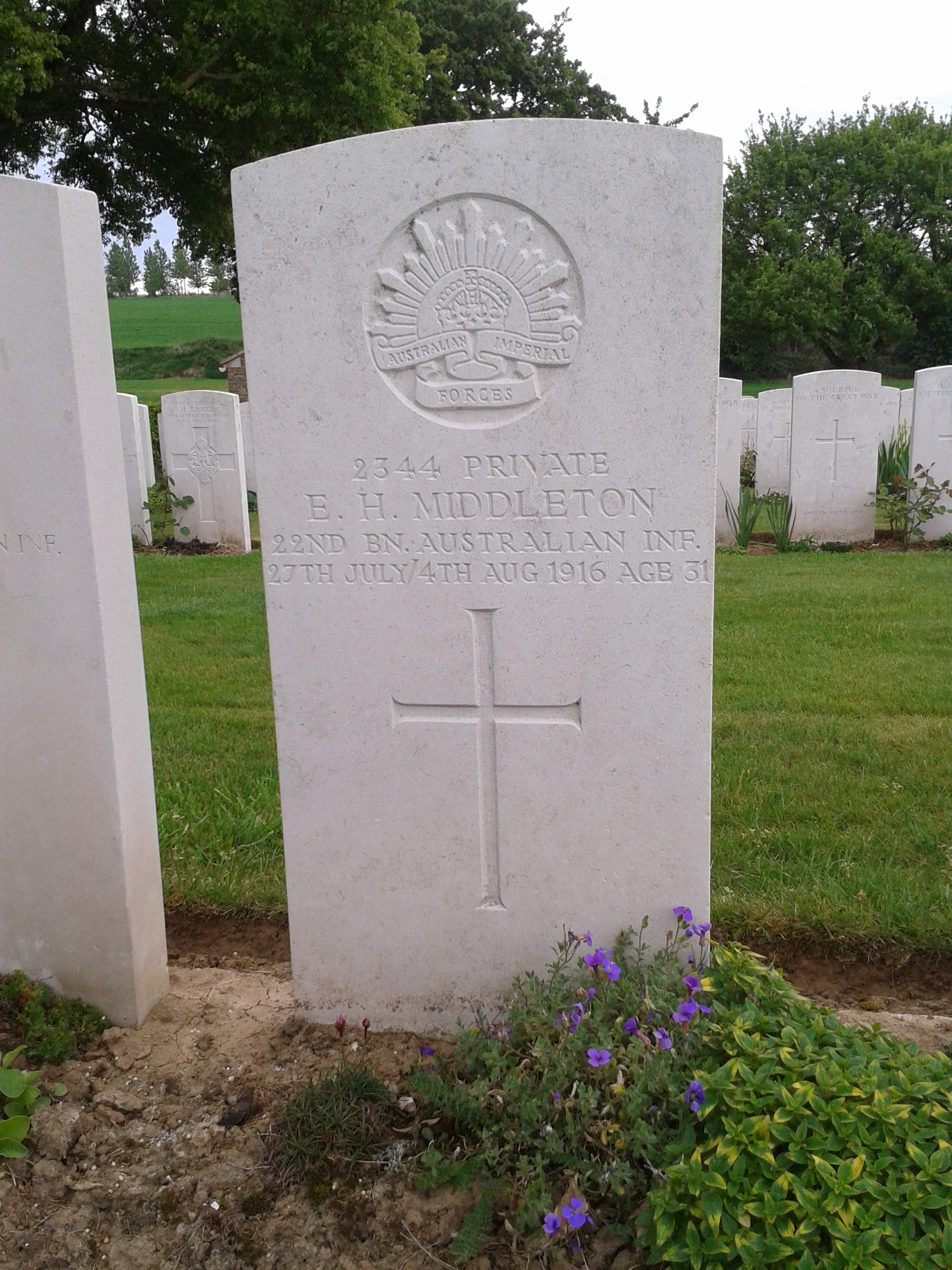 Born in North Fitzroy, Ellis Middleton the 31 year-old brass-finisher from Moonee Ponds working with South Melbourne firm John Danks, enlisted into the AIF on 10th July 1915 and sailed with the 5th/22nd on the RMS Osterley on 29th September 1915 for Egypt. After a period of training and being Taken on Strength into the 22nd Battalion on 8th January 1916, Pte Middleton set sail from Alexandria on the Llandovery Castle on the 19th March 1916 to join the BEF in France. Pte Middleton served with the 22nd Battalion in the nursery sector of Bois Grenier before moving south as part of I Anzac Corps for the great Somme offensive. The 22nd Battalion moved forward into Pozieres in the early hours of 27th July 1916 and sometime between 27th July and 4th August 1916 Pte Middleton was killed in action. Pte Middleton was buried at the Gordon Dump Cemetery, Ovillers-La-Boiselle. Pte Middleton had a younger brother 53 Pte CH Middleton of the 7th Battalion who was wounded in action at Gallipoli and discharged in April 1916.