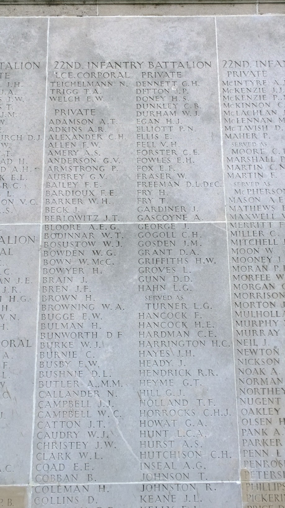 19 year-old tinsmith Louis Gilbert Hahn from South Melbourne gave his name and served as Gilbert Turner when he enlisted into the AIF on the 10th July 1915. Pte Turner sailed on the RMS Osterley with the 5th/22nd on 29th September 1915 for Egypt. Within days of his arrival in Egypt Pte Turner was admitted to Luna Hospital with diarrhoea where he would have become acquainted with the horrors of war seeing many wounded from Gallipoli. Pte Turner was discharged from hospital and continued training, being Taken on Strength into the 22nd Battalion with the rest of the 5th/22nd on the 8th January 1916, before sailing on the Llandovery Castle on 19th March as the AIF joined the BEF in France. Pte Turner served with the 22nd Battalion in the ‘nursery’ sector of Bois Grenier before moving south as part of I Anzac Corps for the great Somme offensive. The 22nd Battalion moved forward into Pozieres in the early hours of 27th July 1916 with Pte Turner, as part of C Company, occupying the front line trenches. Here the Battalion endured a terrific bombardment from the German guns until they were relieved on 30th July. This relief was short lived and on 4th August the 22nd Battalion commenced its passage through the heavily shelled trenches of Pozieres to the jumping off trench for an attack on the German trenches known as OG1 and OG2. C Company successfully pushed through to OG2 and began to dig in, in preparation for the counter-attack which came at dawn. It was during the fighting on 5th August 1916 that Pte Turner was at first reported wounded then missing in action. The Court of Inquiry of 11th August 1917 concluded that Pte Turner was killed in action and is thus commemorated on the Villers-Bretonneux Memorial. Pte Turner had a brother 2911 Pte RW Williams that served with the 2nd Battalion.