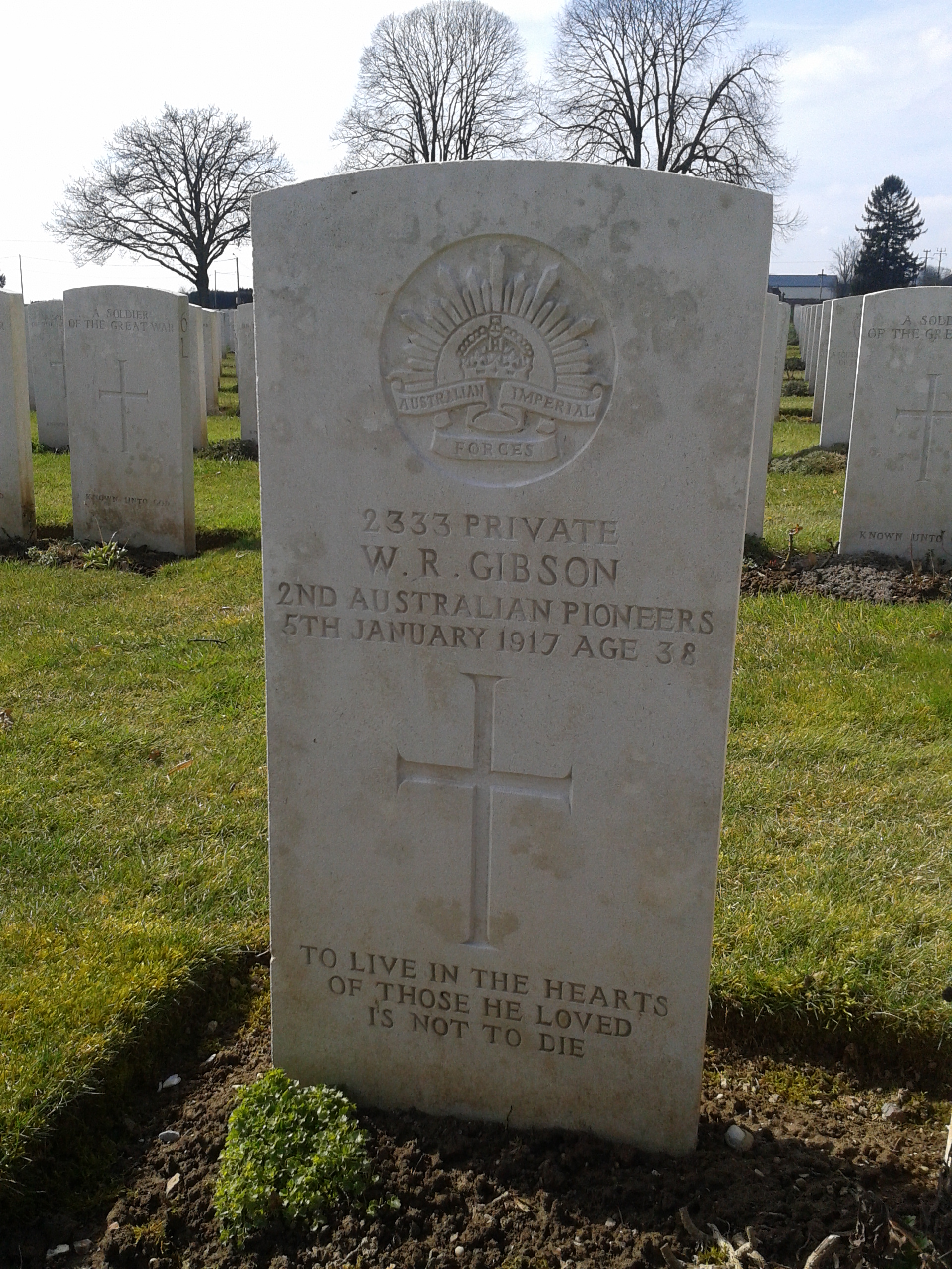 Northern France. On the 30th September 1916 Pte Gibson was transferred (along with Sloss and Spicer) to the 2nd Pioneer Battalion responsible for the construction of field fortifications including trenches and dugouts, military camps, bridges and roads. The 2nd Pioneers returned to the Somme with the AIF 2nd Division at the end of October and began the difficult task of digging new front line and communication trenches in the atrocious muddy conditions of the Flers Sector, all the time under the threat of being observed and shelled. Pte Gibson was killed in action on 5th January 1917 and was buried at Delville Wood Cemetery, Longueval.