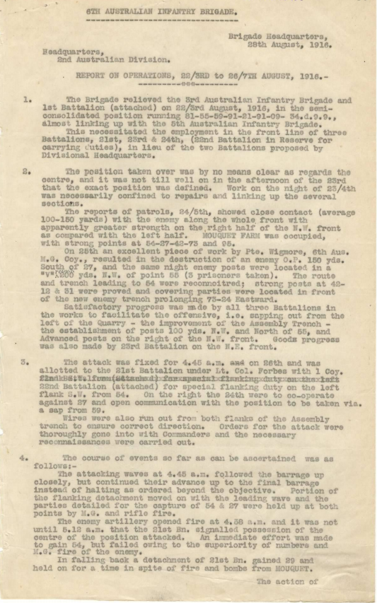 26th August 1916: The 6th Brigade attacked Mouquet Farm at dawn (Brigade report, below). The artillery barrage, which for the first three minutes advanced in steps of about fifty yards a minute, was laid down by four brigades of artillery, while seven batteries of heavy howitzers, which for some days had battered the objectives, fired heavily for five minutes on the Fabeck Graben strongpoint. The 21st Battalion which thirty minutes before the starting time had climbed out of the front-line trench and lain down twenty-five yards ahead now followed the screen of bursting shells. Though the ground was rough with shell holes they were dimly lit and the troops were able to keep up with the line of shells and made progress towards the farm and managed to seize the trench. To the east the 24th Battalion was also making progress and began bombing the cellars of the farm, rousing the defenders who started to set up their machine gun rendering digging and further bombing impossible.