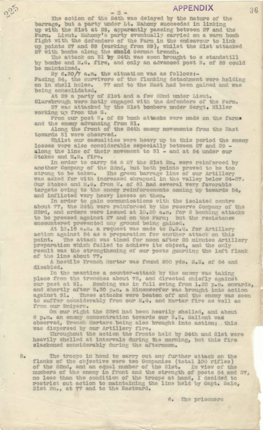 These weeks were marked by great aeroplane activity over the battlefield, the Allies – on some days with at least fifty machines simultaneously in the sky – endeavouring to maintain their local superiority. The day of the relief was one such day and as a result the columns moving north were spotted and an intense barrage of shrapnel and high explosive followed, and the 24th which had suffered heavily in Kay Trench four weeks earlier, was again caught. The guide for one company was killed and the officers had to grope the best they could through the moonless night.