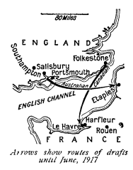 29th June 1917: The first Australian depots in France were established in March 1916 at Etaples, but this was inconvenient both in time and increased risk of submarine attack. Etaples camp was not a pleasant place and with tough training regimes soldiers were said to be pleased to return to their units on the front! The line of transport from Southampton to Etaples crossed that of the Canadians whose English depots were near Folkestone and their French depots at Le Havre, consequently in June 1917 the depots of the two dominions changed place, with the Australians moving to the much nicer location of Harfleur outside of Le Havre (map source: Bean Official History Vol III, P.178)