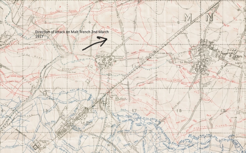 2nd March 1917: Three battalions of the 7th Brigade, with the 5th supporting on the right, attacked towards Malt Trench. Despite bombing attacks, artillery and counter-attacks the 2nd Division had established itself on the Loupart bastion and in position to create a ‘jumping off’ line for Gough’s intended assault on the next main German R.I. Line. The AIF 1st Division to the east had been digging in when came a series of counter-attacks, with the Germans penetrating behind the Australian lines. Both sides had men killed and captured, though the loses to the German attackers had been greater.