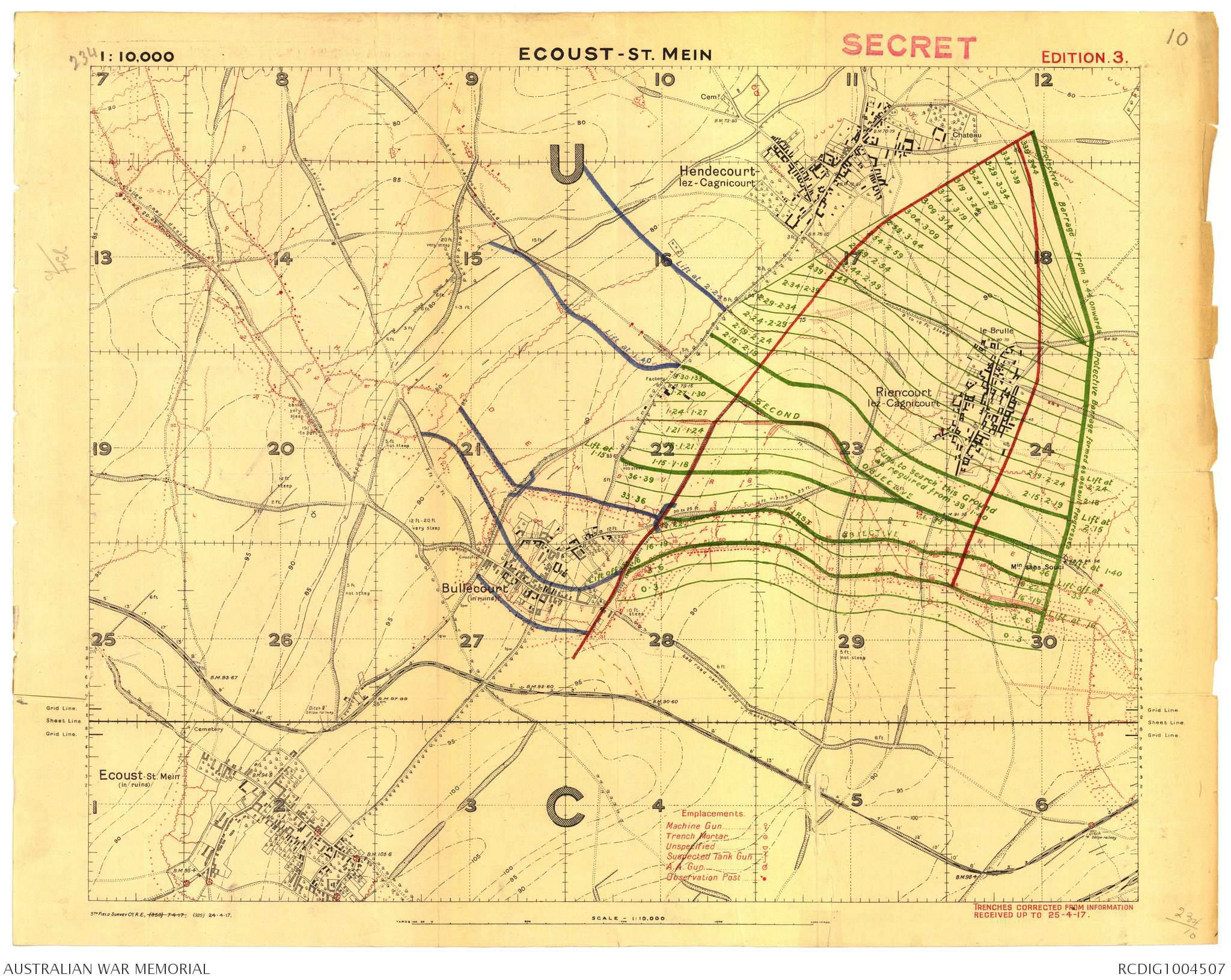Two guns from 6th Machine Gun Coy will accompany 4th wave for action against the Factory and NW trenches as well as enfilade of Road from Hendecourt. These guns will be in readiness to move to our left to enfilade Boundary Road on the west.
