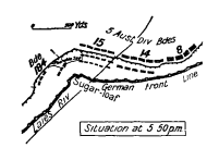 British 61st Division and the Australian 5th Division attacking either side of a German stronghold known as the Sugarloaf. Each Battalion had an assault front of about 300 yards (270 metres). The total artillery would be 258 field-guns and howitzers, 64 heavies, 70 medium trench-mortars and two 12-inch howitzers on railway tracks and one or two of the long-range guns allotted by headquarters of the Armies. (Above photograph showing at the bottom the Australian front, from the narrow No-Man’s Land of the 8th Brigade on the left to the wider area crossed by the 14th Brigade in the middle and the 15th Brigade to the right towards the Sugarloaf salient, shown protruding from the German line.)
