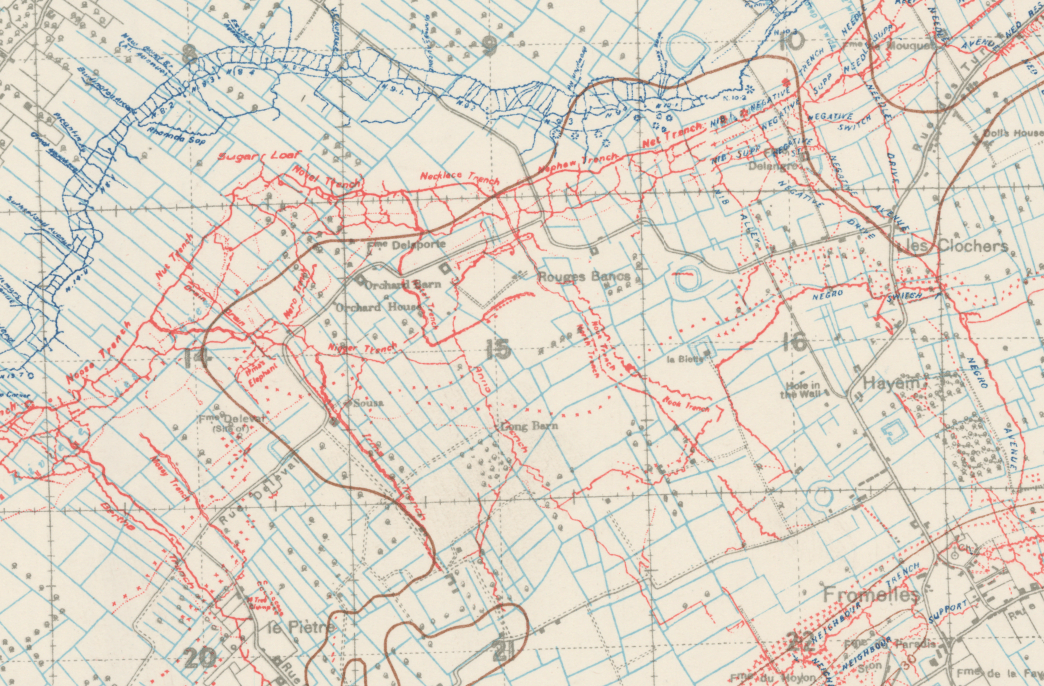 The terrain over which the attack would take place was lowland drained by the River Laies which cut across both front lines and No-Man’s land, but a mile behind the German front line stood a low but abrupt Aubers Ridge that connected the villages of Aubers, Fromelles and Radinghem, offering a strong rear system of defence and good observation posts for the 6th Bavarian Division stationed there. The attack focused on the German stronghold of the Sugarloaf, held by the 16th Bavarian R.I.R. with the Australian Brigades attacking in a southerly direction and the British 184th Brigade south eastwards. [see above map and click link for geo-referenced Trench Map, reproduced with permission of the National Library of Scotland]. Of the three Australian Brigades making the attack, the 14th (53rd, 54th, 55th, 56th Battalions) and 15th (57th, 58th, 59th, 60th Battalions) contained about a quarter of their men that had fought in Gallipoli, but for the 8th (29th, 30th, 31st, 32nd Battalions) this was their introduction to fighting. For the six assaulting Battalions from these three Brigades, the 31st and 53rd Battalions had been in the firing line for just two days, whereas the 32nd, 54th, 59th even less, and as for the 60th Battalion this was their first venture into the firing line on the Western Front.