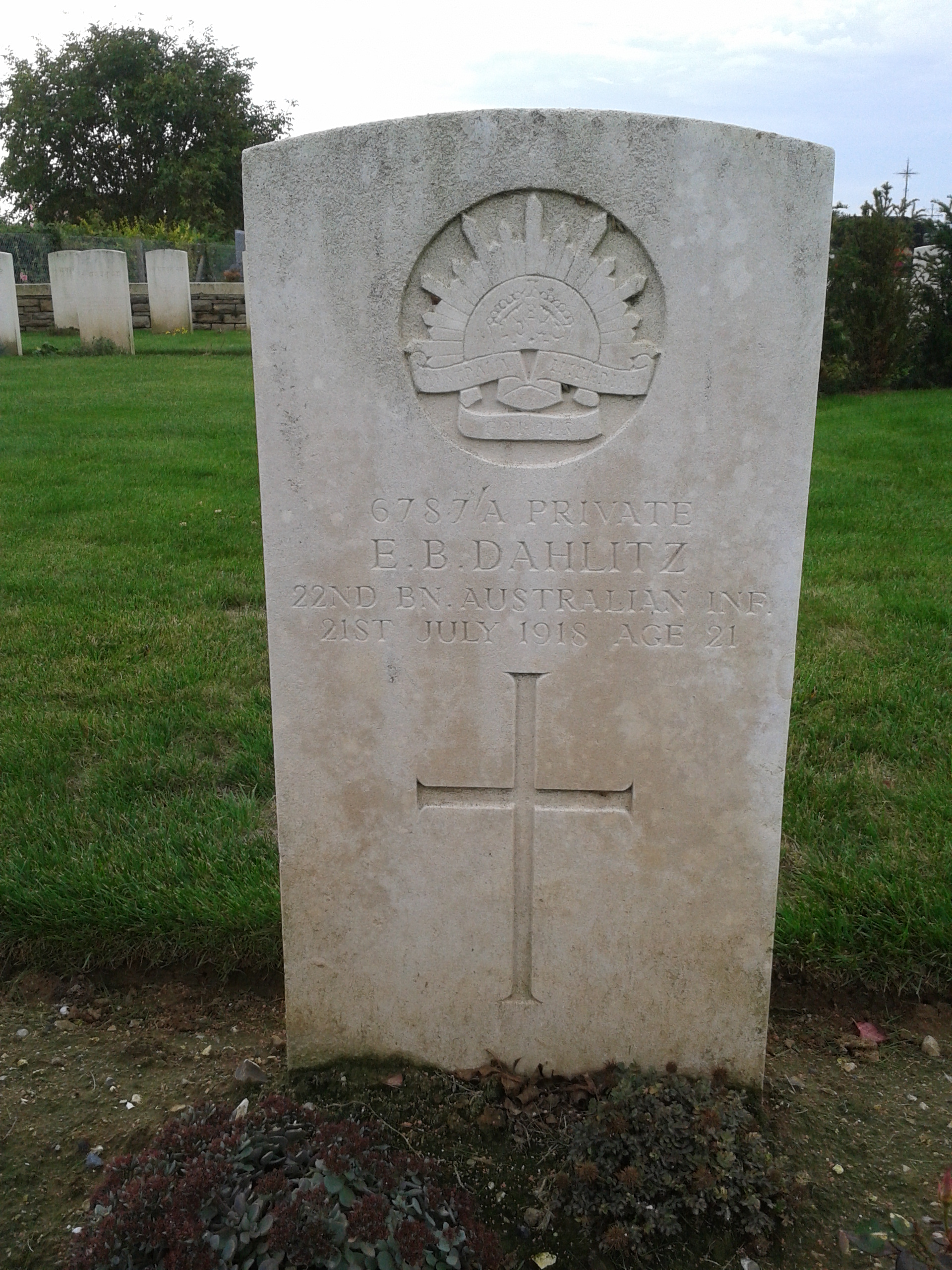 | 6787A | Private | DAHLITZ | E B | 21 | Died of Wounds | 21/07/1918 | France | ST. RIQUIER BRITISH CEMETERY |