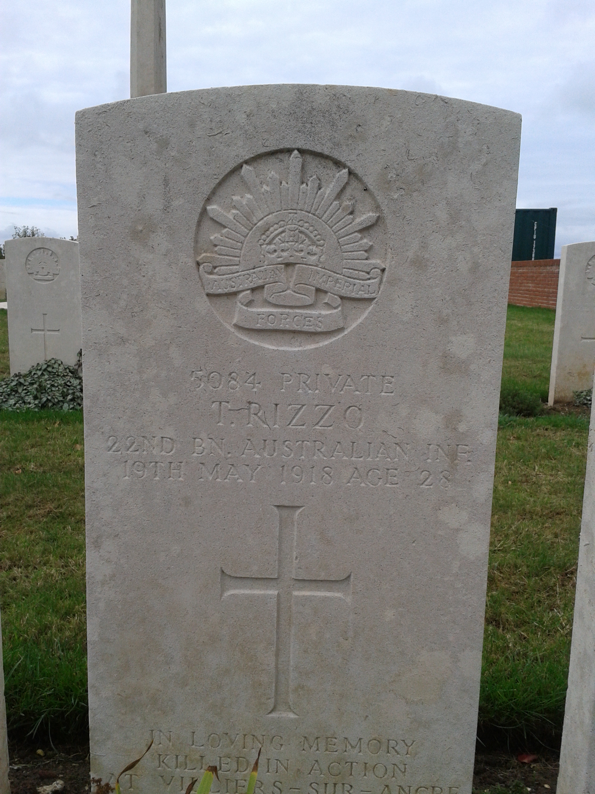| 5084 | Private | RIZZO | T | 28 | Killed in Action | 19/05/1918 | France | DIVE COPSE BRITISH CEMETERY, SAILLY-LE-SEC |