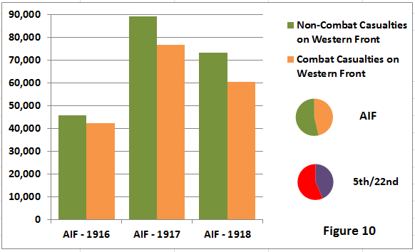 Gallipoli and Egypt could be seen as the transition point from a time when just a decade before more troops would die from serious non-combat related diseases than in battle, to a point at the end of the war in 1918 when the serving soldiers would be exposed to the same non-combat mortality risks as the wider civilian population. However despite great improvements in the field of medicine at the beginning of the last century and the deeper understanding of the causes of disease that led to the decrease in non-combat casualty deaths, sickness and disease – as shown in hospitalisation rates in Figure 2 above plus total casualty numbers in Figure 10 – still provided the most common cause of manpower wastage during the Great War. When combined with the length of time that the casualty would be away from his unit as illustrated in the previous section (Figure 3), then sickness and disease did have a significant impact on the fighting strength of the AIF during the First World War.