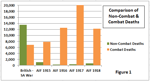 Discussion of war casualties tends to focus on the numbers killed or wounded in combat, however history is filled with campaigns where losses caused by non-combat related issues of disease and illness had a greater impact on the outcome. A century before the Great War, Napoleon Bonaparte marched his French Army of 600,000 men into Russia, but by the time they had retreated back into Poland this once proud army had been reduced to just 100,000, the majority having succumbed to exhaustion and exposure due to the lack of food and the harsh conditions of the Russian winter. From the mid-1800’s when the British began to keep detailed military medical records, every military campaign of that century had more hospital admissions for non-combat than combat causes, plus a soldier was more likely to die from illness or disease than on the battlefield. This included Crimea in the 1850’s and the Boer War in South Africa – as shown above in comparison of non-combat and combat deaths (Figure 1 – click on the figures to expand) and hospitalisation (see Figure 2 below) – just a decade before the start of the First World War, and in which a number of the original AIF were veterans.
