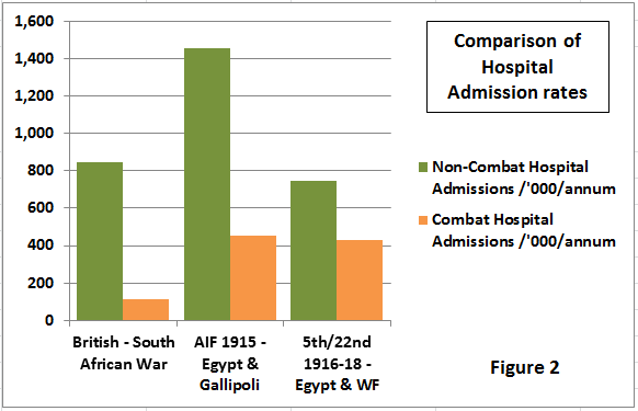 capability of each unit as can be seen in the hospital admissions shown in Figure 2 (represented per 1,000 men per annum for comparison). Here it can be seen that the hospital admissions per 1,000 men were higher for the AIF in Gallipoli than for the British in South Africa. A comparable figure for the AIF on the Western Front is not available, but the case study group of the 5th/22nd on the Western Front shows a non-combat hospitalisation rate similar to that of South Africa. When these rates are multiplied by the full fighting force of the Armies of the First World War then it can be seen that the medical services were having to receive and treat millions of cases and the military strategists to ensure sufficient replacements.