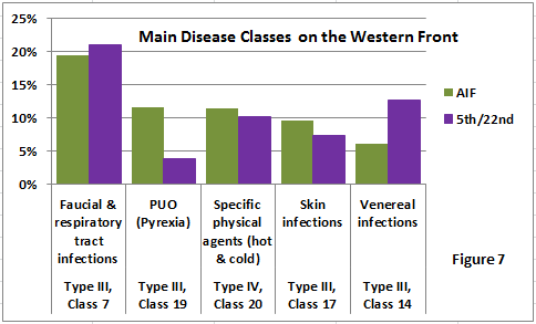 case study group are provided for comparison and show similar value with respect to respiratory tract infections, environment and fatigue, and skin infections. There are differences in frequency of admissions for PUO and also venereal disease. With regard to the latter, a previous case study paper on discipline within the AIF showed that the 5th/22nd had a worse discipline rate than the average for the AIF, and a number of the persistent illegal absentees (Absent Without Leave) that ended in Courts Martial and penal servitude were also repeat offenders for venereal disease, so a possible correlation between infection frequency and poor discipline.