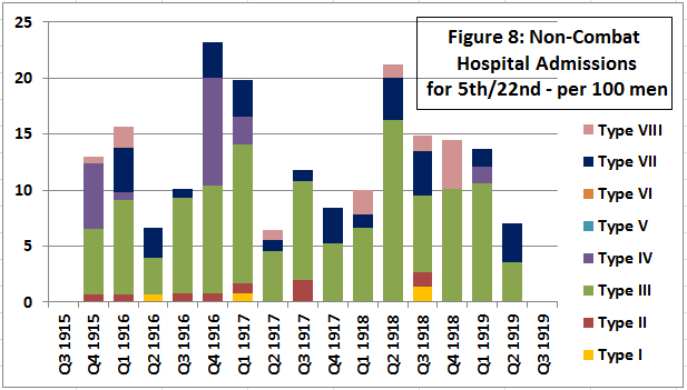 Using the 154 men of the 5th/22nd as a case study covering the period from the training camps of Egypt to the Western Front, removing the 116 men that had been a combat casualty at some point in the war (killed, wounded or both), together with the six men who went through the entire war without requiring some form of hospital treatment, this left 32 men or 20% of the group that were hospitalised with sickness or disease. Between them the remaining 32 non-combat casualties accounted for 67 non-combat cases of hospital admission – approximately two cases per man – but as can be seen in Figure 3 they were available to their unit for only 45% of the time on average. This surprisingly low figure compares with 31% for the combat casualties only, many of whom were either killed or severely wounded within the first seven months during the fighting at Pozieres. Translating this in to time, with the 5th/22nd being on active service for 137 weeks from the time they were Taken on Strength on 8th January 1916 to Armistice Day, this means that on average the non-combat casualties amongst this case study group were spending 62 weeks with their unit but 75 weeks in the hospitals, camps, some in detention as a result of disciplinary action on account of going Absent without Leave during which they caught a venereal disease, or – as was the case for fifteen, i.e. half of these men – having been discharged early as a result of their medical condition. Therefore it can be seen that non-combat wastage was having as much a detrimental impact as losses due to combat on the fighting strength of the AIF infantry battalions during the war.