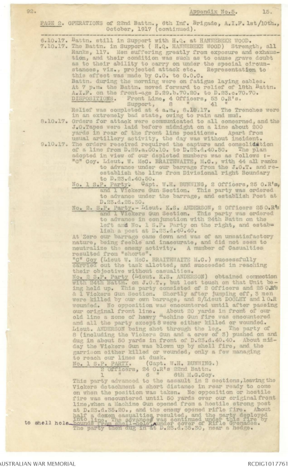 were received to move forward and relieve the 18th Battalion of the 5th Brigade. Torrential rain was now making the conditions worse but Haig, to the surprise of many, decided to push on with the offensive. General Birdwood, who knew that his troops were at the limits of endurance through exhaustion, hoped for a postponement but as his Corps had but a slight task on the flank of the next attack he did not protest. The fighting strength of the 22nd Battalion at this stage was now little more than 100 men, and it was thus necessary to bring up the men that had been in reserve and acting as the Battalion nucleus at Caestre.