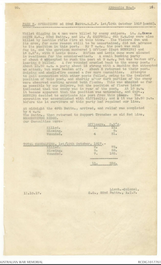 The French First Army and British Second and Fifth armies attacked on 9th October 1917 in what was known as the Battle of Poelcapelle from the Broodseinde ridge towards Passchendaele. The 6th Brigade was to support the attack by the 5th Army to their left, and with the 22nd Battalion the furthest right of the Brigade’s four battalions, south of the Broodseinde – Zonnebeke road, in grid block D.23.d. [click link for geo-referenced Trench map reproduced with the permission of the National Library of Scotland]. The junction was with the 8th Battalion on their right who stayed put during the attack was thus the pivot point for the attack. The supporting artillery was not able to move forward due to the mud and as a result the barrage was so thin that from the start the German machine guns were able to cause havoc for the advancing parties. Two detachments of the 22nd under Capt. Bunning and Lieut. Anderson attacking the area of the old German Headquarters at the sandpit reached their objective but suffered heavily in the fighting with the nearby German posts. The southern party under Capt. Bunning – who was awarded the MC for personally carrying out a dangerous reconnaissance – reached its position under cover of rifle grenades, but Lieut. Campbell of the 6th Machine Gun Company was killed by a shell that caused casualties amongst the entire Vickers Gun crew. While digging in Lieut. Skene-Smith who had only just returned to the Battalion was wounded then sniped and killed while on a stretcher. The northern party under Lieut. Anderson, MC, had only gone 20 yards when it was nearly wiped out, severely wounding Lieut. Anderson and Lieut. Dooley, but eight survivors under Lieut. Chalmers pushed on. There was no communication trench to the rear and as result German snipers took a heavy toll. 2176 Pte Moore (MM) covered the consolidation of his post by vigorous sniping until relieved despite being physically exhausted and only 20 yards from an enemy block house. 6044 Pte Brodie (Belgian Croix de Guerre) was a first class marksman and used his skill to the full to prevent his party located close to a strongly garrisoned Pill Box suffering further casualties from these hostile snipers, and three enemy rushes were beaten off largely due to Brodie’s shooting. Twenty men from the 22nd Battalion were either killed or died of their wounds during this flanking operation.