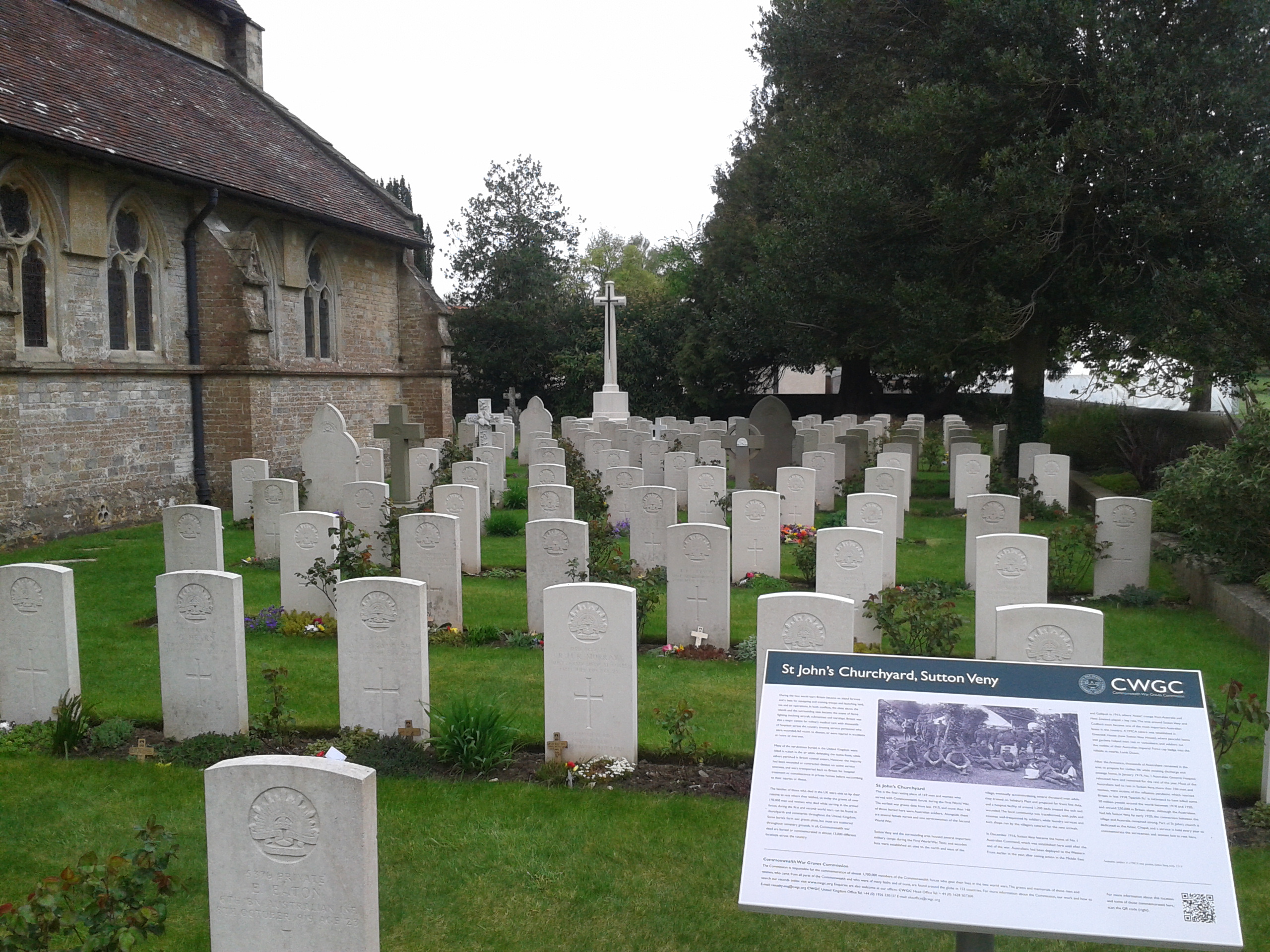 In January 1919 staff of the 1st Australian General Hospital transferred to Sutton Veny from France, and at this time many patients were suffering from the Spanish influenza epidemic. At the end of 1919 other Australian depots in England were closing with Sutton Veny becoming the final assembling base for Australians from France, where they had mostly engaged in reburial work. Once all the troops had departed most of the huts were removed and the camp railway lifted. Given that 1st AGH had relocated to Sutton Veny, a large number of Australians are buried in the St. John churchyard (photograph above), many of the