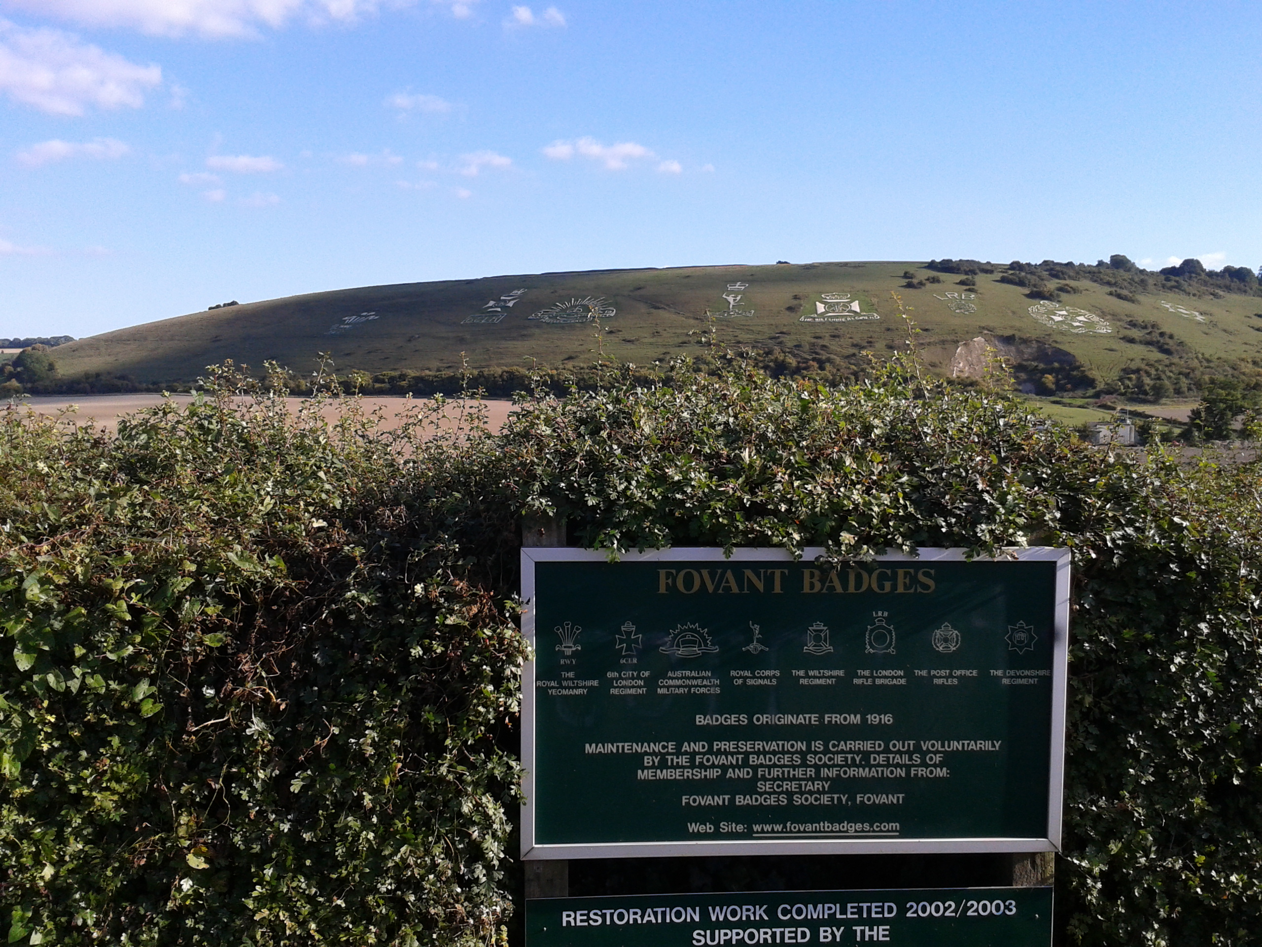 In 1924 a cross was erected in Fovant churchyard (photograph left) in memory of the forty-three Australian and twenty British soldiers buried there after dying in Fovant Military Hospital. An impressive reminder to the presence of troops in this area can be found on a nearby hill, where the ‘Rising Sun’ cap badge can be seen along with seven other regiments insignia carved into the chalk, known as the Fovant Badges (photograph below).