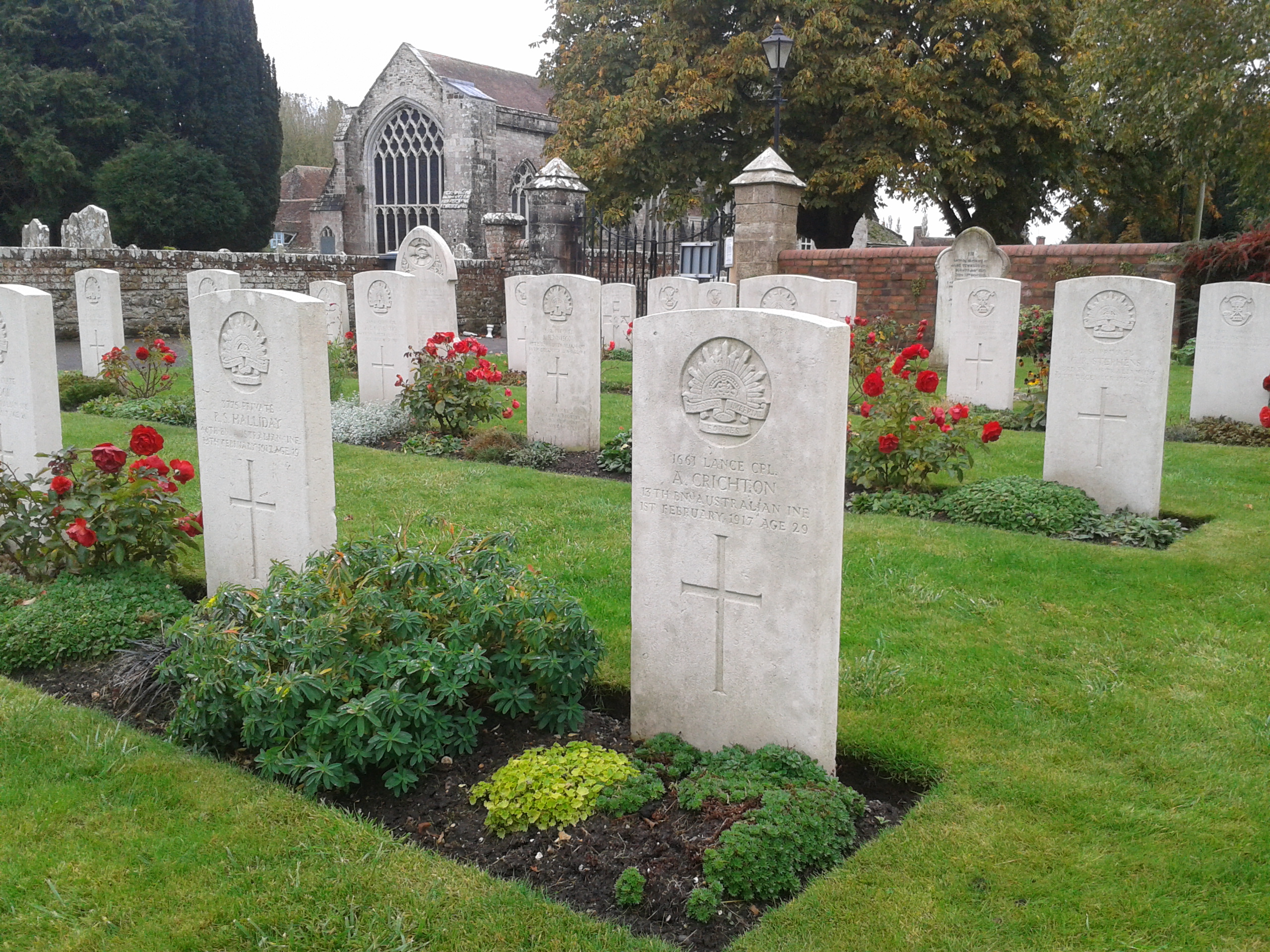 Situated at Worgret Hill near Wareham, the Dorset camp became in October 1916 the AIF No.4 Command Depot to receive the overflow from other AIF depots, caused by the influx from the fighting on the Somme. The Wareham Town Museum has produced two information panels (Wareham Camp & Wareham Town) that provides an insight into the camp, entertainment and life in general in the town during the Great War. As with the other Australian depots it was a camp for men likely to be fit in three months to resume active service. Sadly this would not be the case for thirteen Australians whose final resting place is in the churchyard of Lady St. Mary Church in Wareham. To learn about the Australians that are lying in Wareham, visit the WW1 Australian Soldiers & Nurses who rest in the United Kingdom project website.