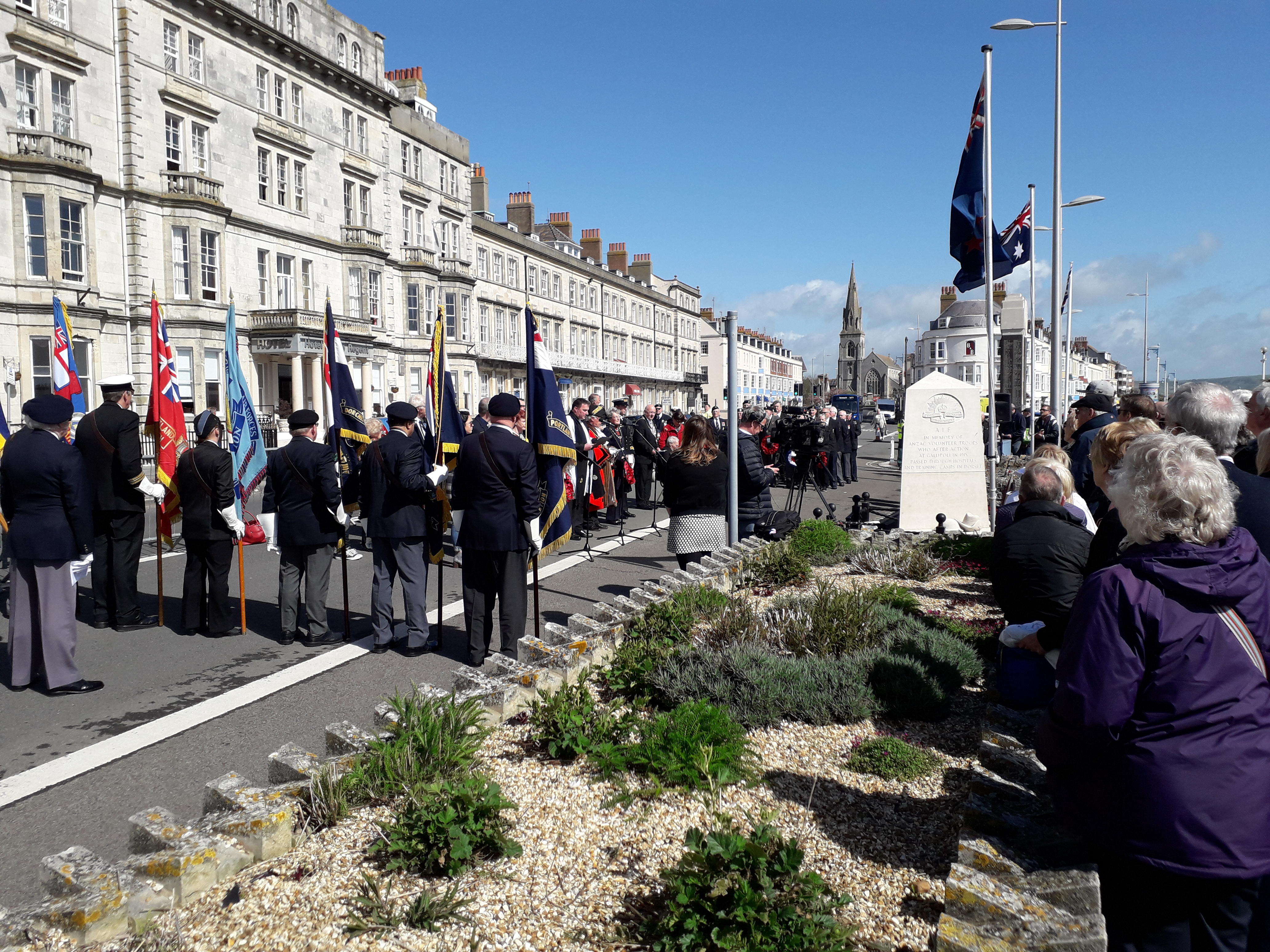 In the town today the Anzac Memorial on Weymouth seafront (pictured above during the annual Anzac Day service) commemorates the Australian and New Zealand troops who were accommodated in the three camps in the town (Monte Video, Westham and Littlemoor) during WW1. In Weymouth and Melcombe Regis Cemetery (pictured above), close to the site of the Westham camp, there are eighty-six graves of Anzacs who were never to return home. Also in memory of the troops that passed through Weymouth there are a number of roads in a housing estate built on the former site of the Westham Camp that are named after Australian cities and states (example in photograph). Residents of these houses are still digging up remains of the camp such as bullets and cooking equipment to this day. More information including photographs, stories and maps showing the locations of the camps can be found in the Weymouth Anzacs web project.
